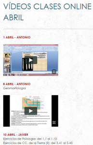 En la primera semana de cada mes se subirán a la web 8 vídeos de clases grabadas en diferido donde se explican 8 temas. Cada vídeo tiene una duración media de 1,5-2 h. Se aportará para cada tema un resumen del mismo, la presentación que utiliza el profesor en la explicación y un audio de la locución del resumen del tema. Podéis ver en este enlace fragmentos de varios vídeos y audios.